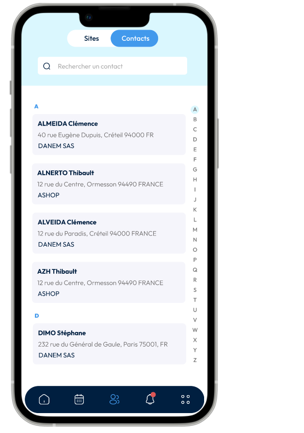 L’onglet des adresses est composé des sites et des contacts du technicien. Il peut rechercher facilement ses différentes données en fonction de son secteur grâce à la barre de recherche située en haut de l’écran.