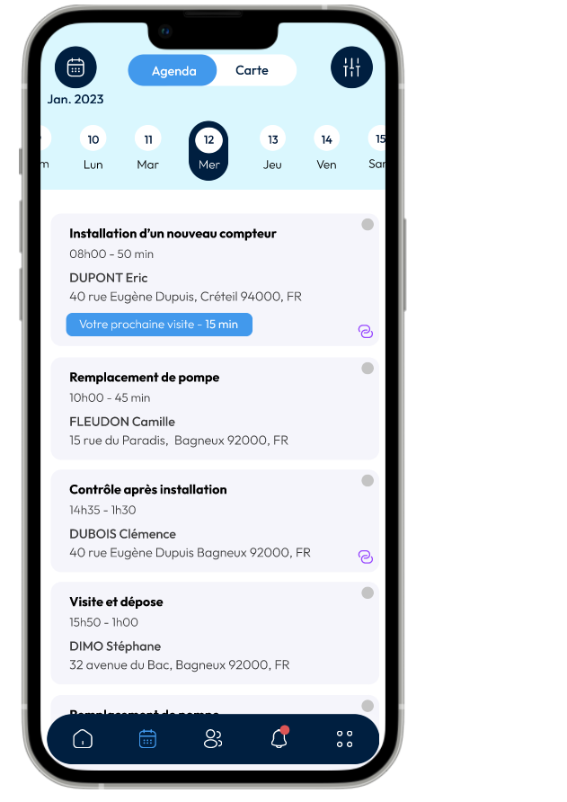 Une fois le technicien connecté sur l'application, il dispose d'un récapitulatif complet de sa journée avec la possibilité d’avoir un aperçu rapide du lendemain.
